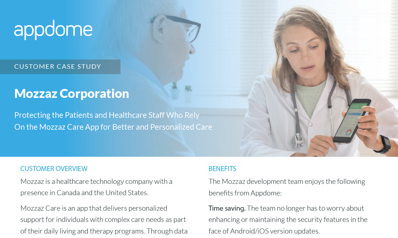 "Being a small engineering team with an aggressive feature roadmap, any development time that we can save goes a long way. Appdome was attractive to us because it saved us from having to develop our own security measures (especially data-at-rest encryption) and become HIPAA compliant, all while we could focus on patient-facing features of our mobile apps.” — Brewin Vaz – Director of Engineering at Mozzaz