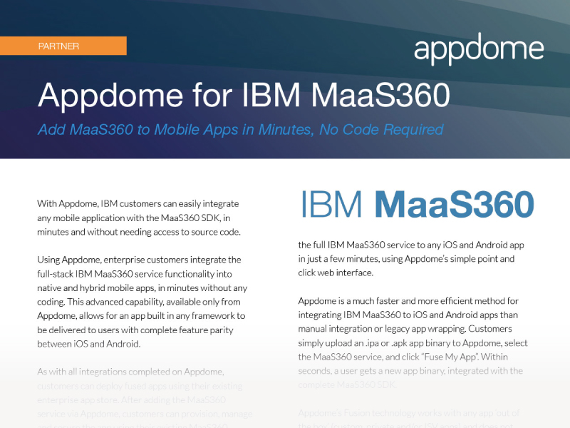This eGuide describes the technology and features on Appdome that allow anyone to complete a no-code IBM MaaS360 integration in minutes. Fusion™, Appdome’s patented technology, automates the IBM MaaS360 integration any app, eliminating the need for source code, coding or app wrapping. Once an Appdome user clicks “Fuse My App,” the full functionality of the IBM MaaS360 SDK is added to the app as if the SDK was coded manually by a developer.