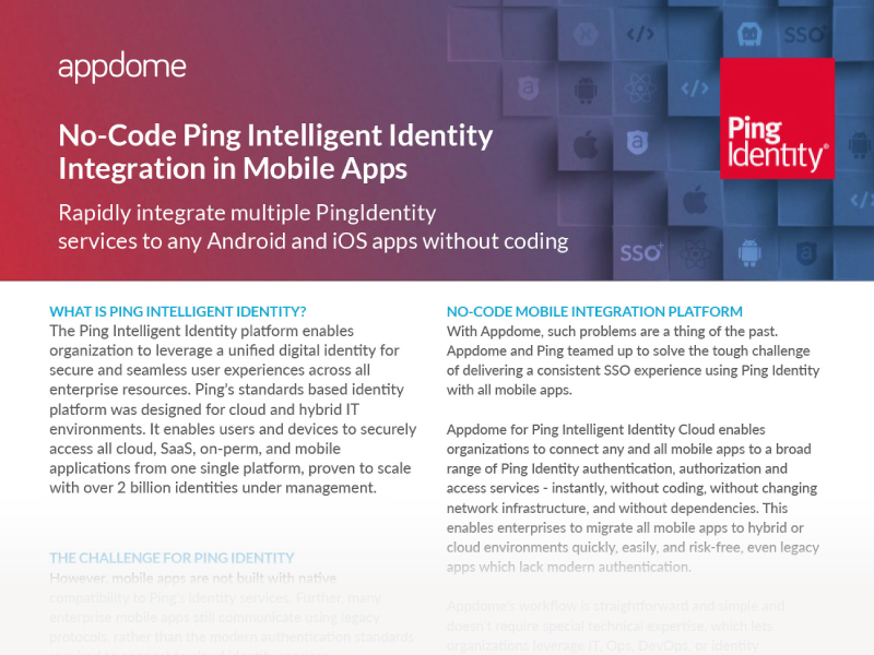Ping and Appdome teamed up to offer Ping Identity for Mobile Apps, a no-code mobile integration solution for Ping SSO and Ping MFA. With Ping Identity for Mobile Apps, anyone can automatically add PingFederate (Ping SSO) or PingID (Ping MFA) to any Android and iOS app, in seconds without code or coding.