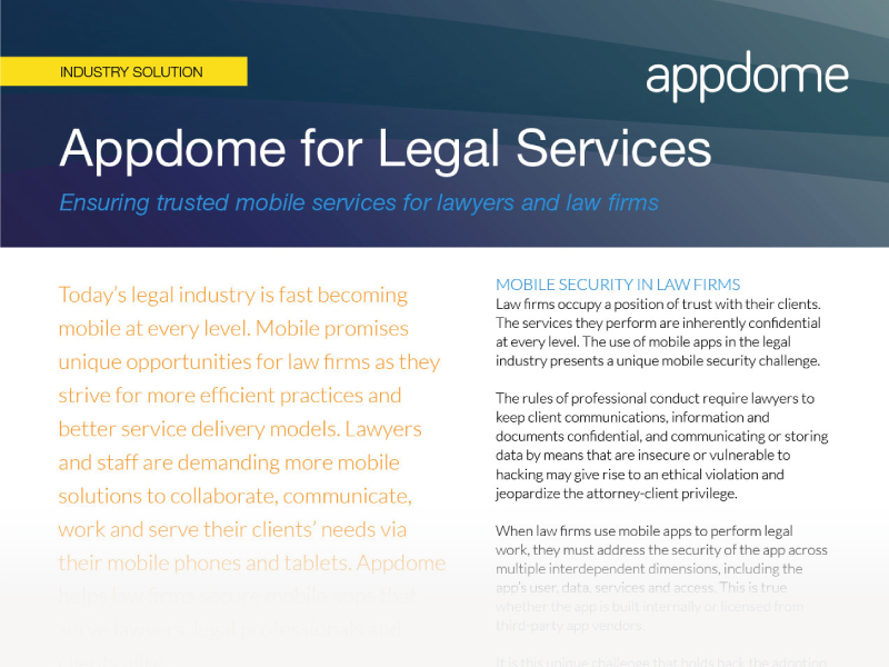 Mobile apps in law firms must be secured at every level. As more legal work goes mobile, risks to client data, confidentiality and professional responsibilities must be addressed by ensuring every level of the app and its data is protected. This case study describes how Appdome helps law firms satisfy their data protection and privacy obligations with respect to all mobile apps, ensuring privacy and security by design in every app – regardless of who built the app.