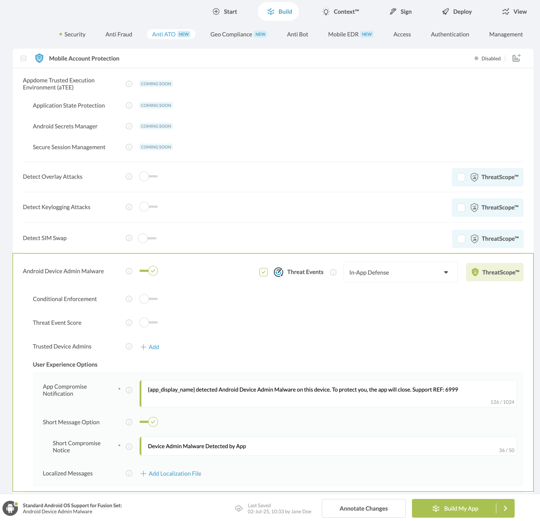 Navigate to Build > Anti ATO tab > Mobile Account Protection section in the Appdome Console.