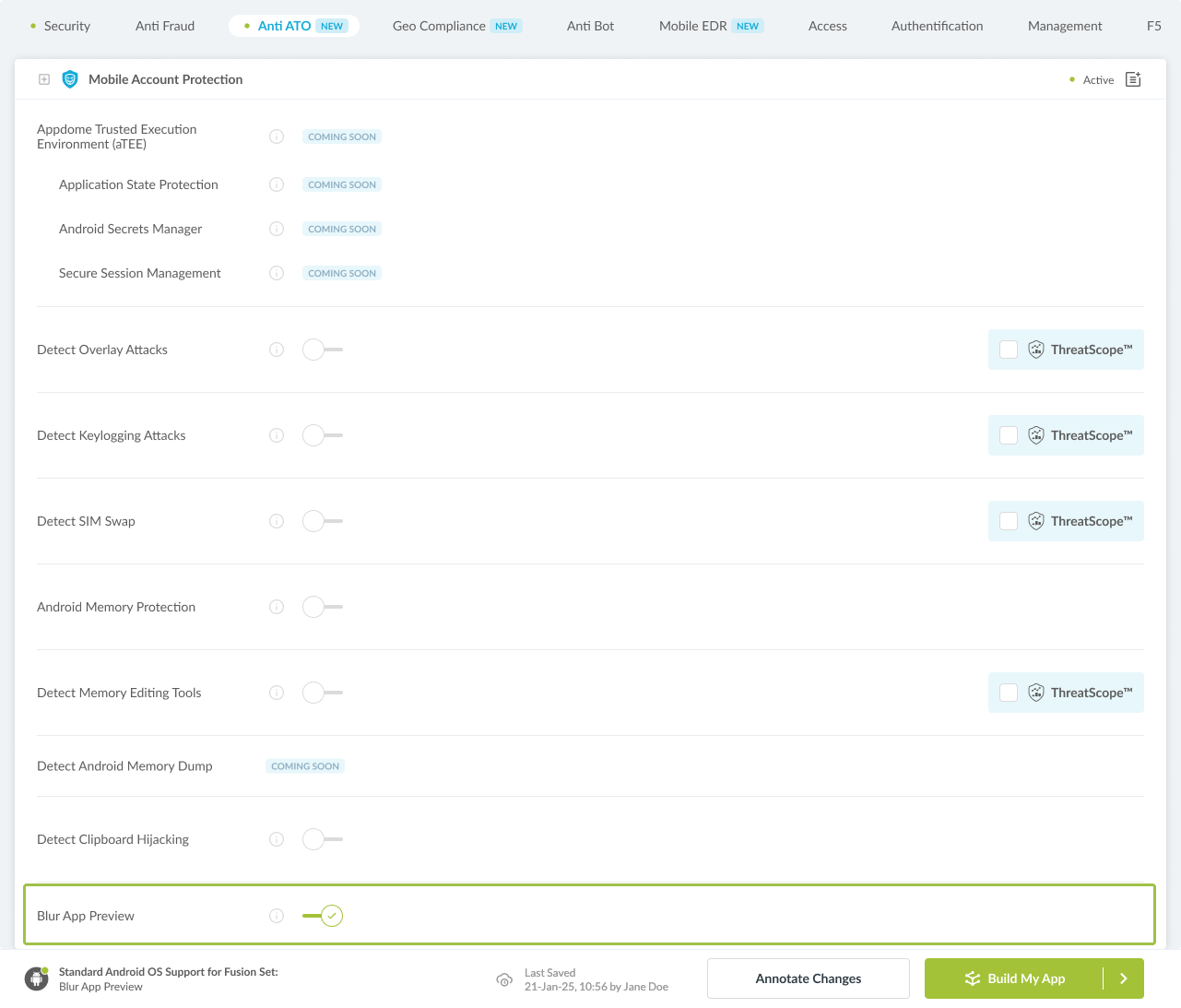 Navigate to Build > Anti ATO tab > Mobile Account Protection section in the Appdome Console.
