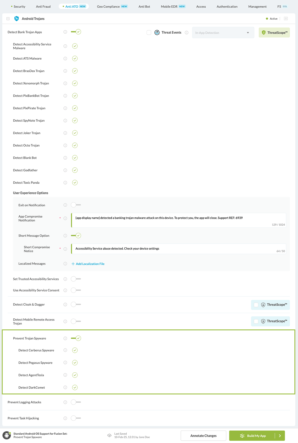 Navigate to Build > Anti ATO tab > Android Trojans section in the Appdome Console.