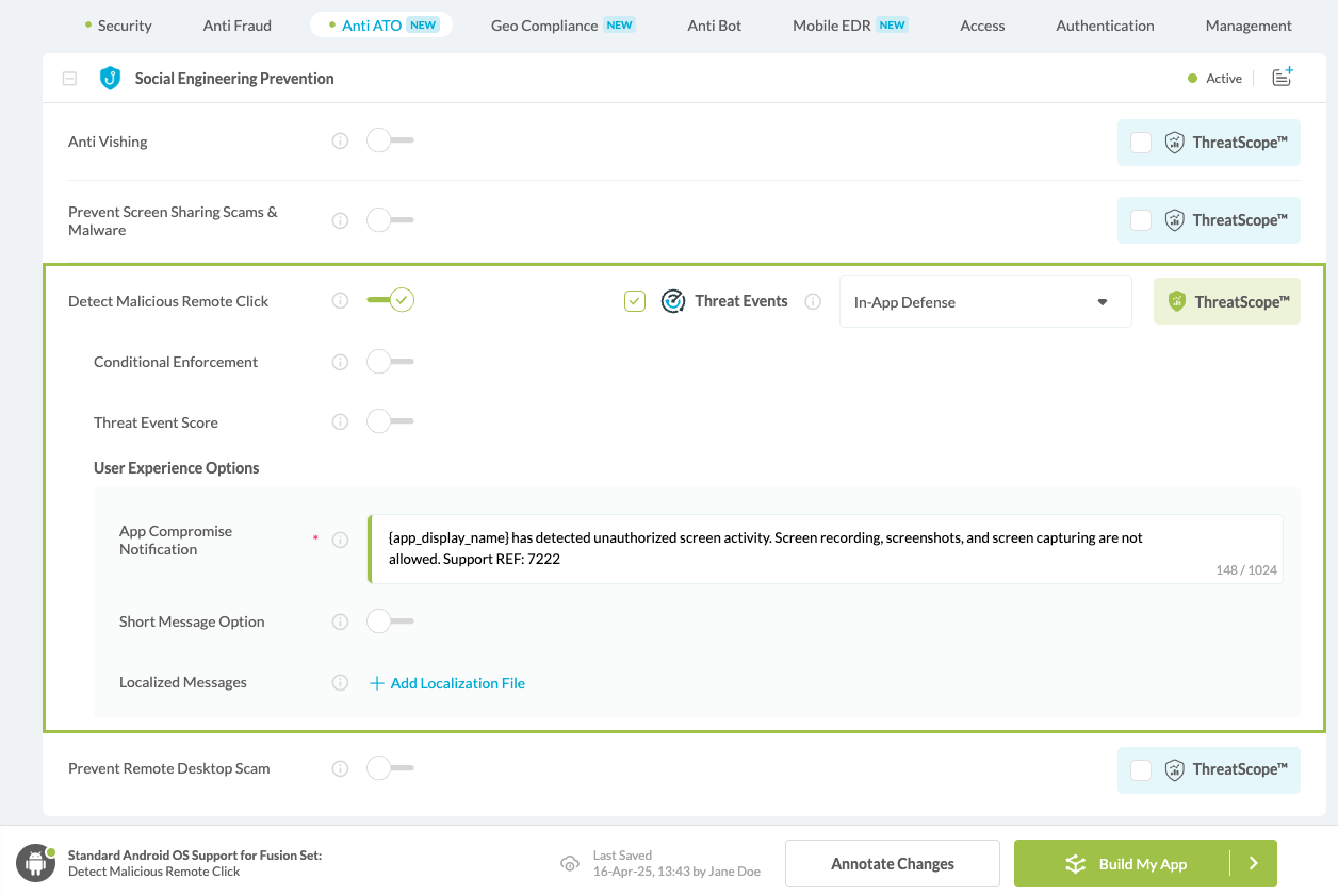 Figure 5: Default User Experience Options for Appdome’s Malicious Remote Click