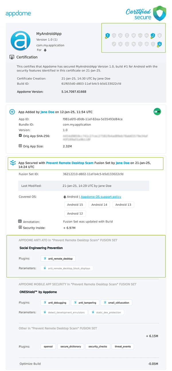 Each Certified Secure™ certificate provides DevOps and DevSecOps organizations the entire workflow summary, audit trail of each build, and proof of protection that Prevent Remote Desktop Scam has been added to each Android app. Certified Secure provides instant and in-line DevSecOps compliance certification that Prevent Remote Desktop Scam and other mobile app security features are in each build of the mobile app.