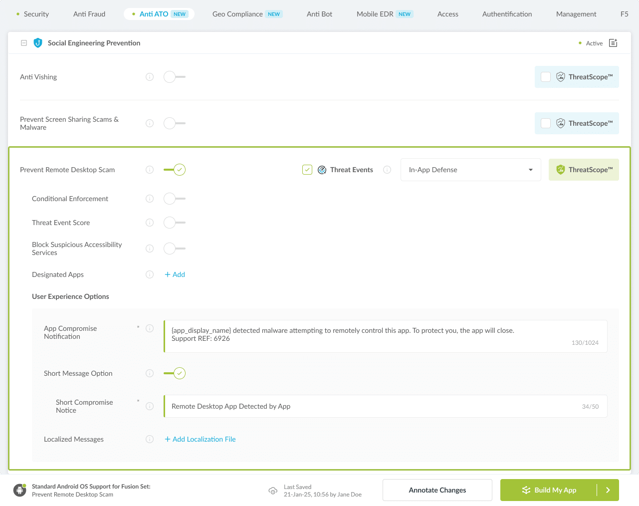 Follow the steps in Sections 2.2-2.2.2 of this article to add the Prevent Remote Desktop Scam feature to your Fusion Set via the Appdome Console.