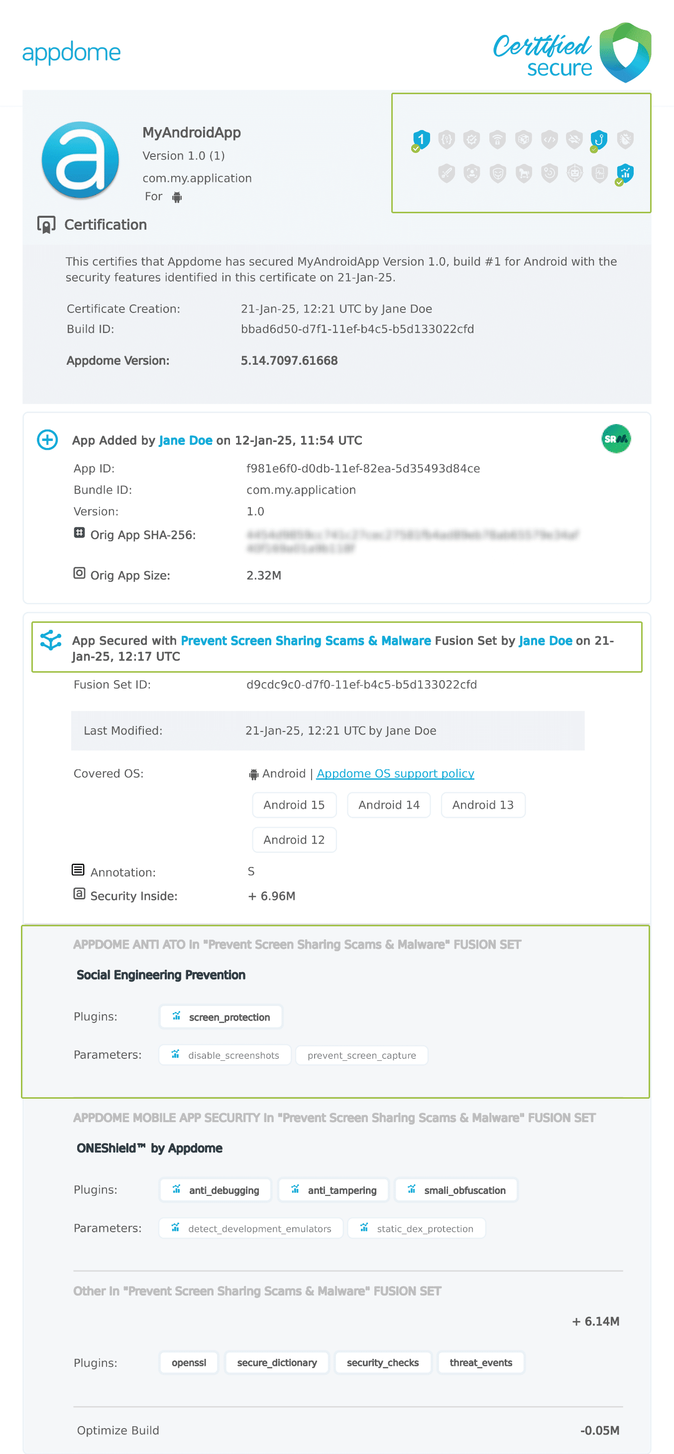 Each Certified Secure™ certificate provides DevOps and DevSecOps organizations the entire workflow summary, audit trail of each build, and proof of protection that Prevent App Screen Sharing Scams & Malware has been added to each Android app. Certified Secure provides instant and in-line DevSecOps compliance certification that Prevent App Screen Sharing Scams & Malware and other mobile app security features are in each build of the mobile app.