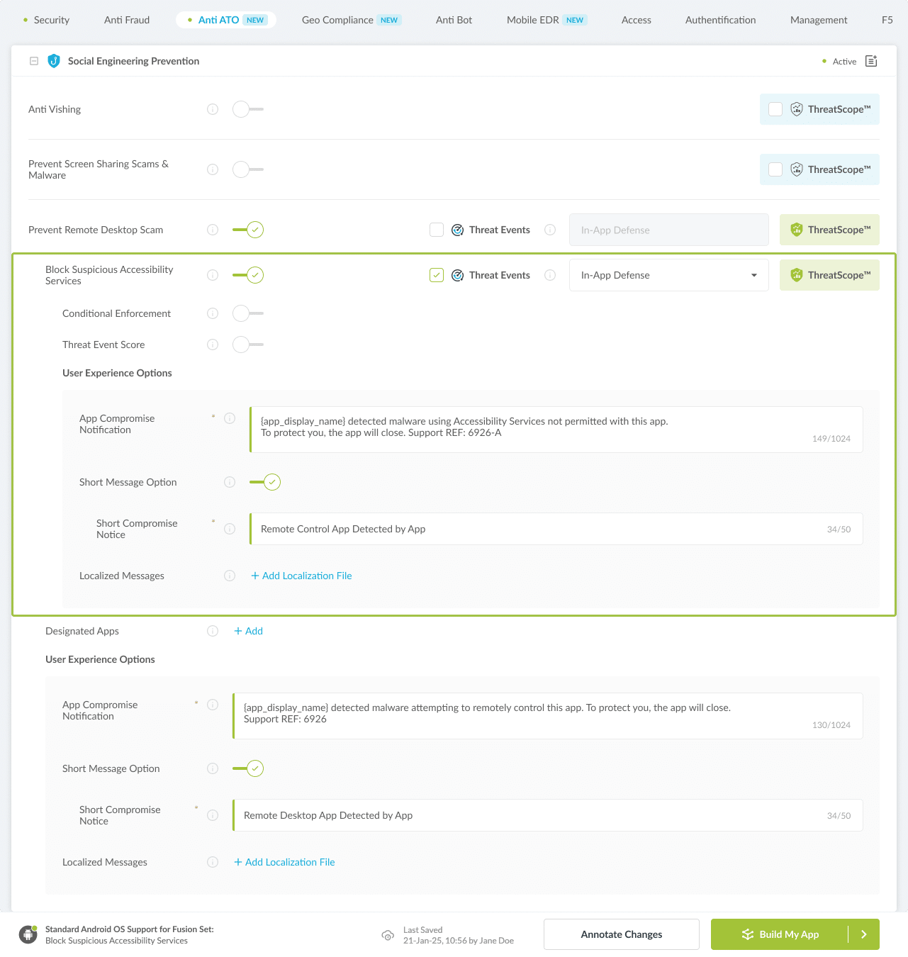 Navigate to Build > Anti ATO tab > Social Engineering Prevention section in the Appdome Console.
