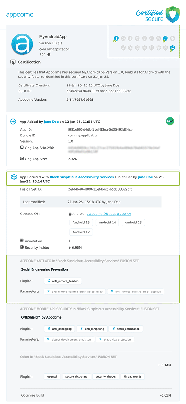 Each Certified Secure™ certificate provides DevOps and DevSecOps organizations the entire workflow summary, audit trail of each build, and proof of protection that Detect Remote Desktop Interactions has been added to each Android app. Certified Secure provides instant and in-line DevSecOps compliance certification that Detect Remote Desktop Interactions and other mobile app security features are in each build of the mobile app.