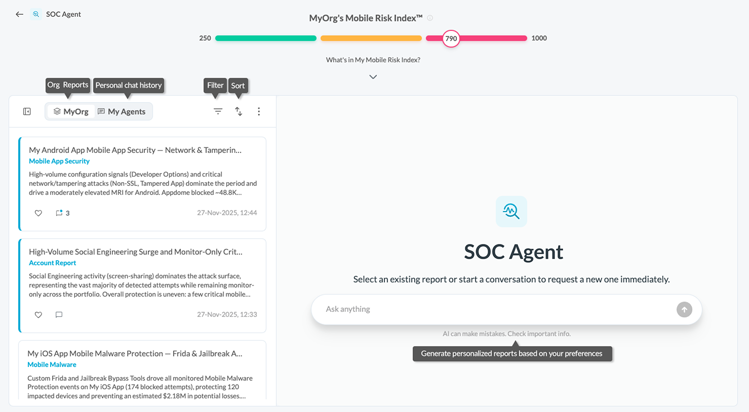 Generates reports instantly for any app, threat category, or timeframe. Automatically produces alerts and insights when new patterns or emerging attacks are detected. All reports are interactive and support follow-up questions through the agent.