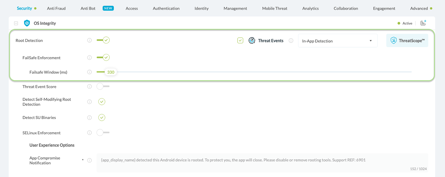 The Threat-Event Score can be set or adjusted according to a user-defined risk model. Threat-Event Scores can be assigned to multiple threats, allowing you to set a threshold for when a security action or workflow will be taken. With Threat-Event Score, developers are enabled to customize the enforcement model and tailor the user experience according to the relative or absolute importance, criticality, or severity level of each threat.
