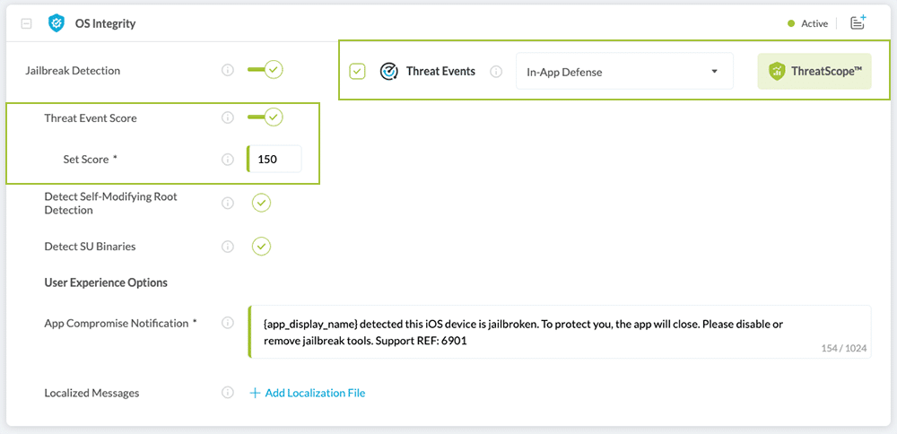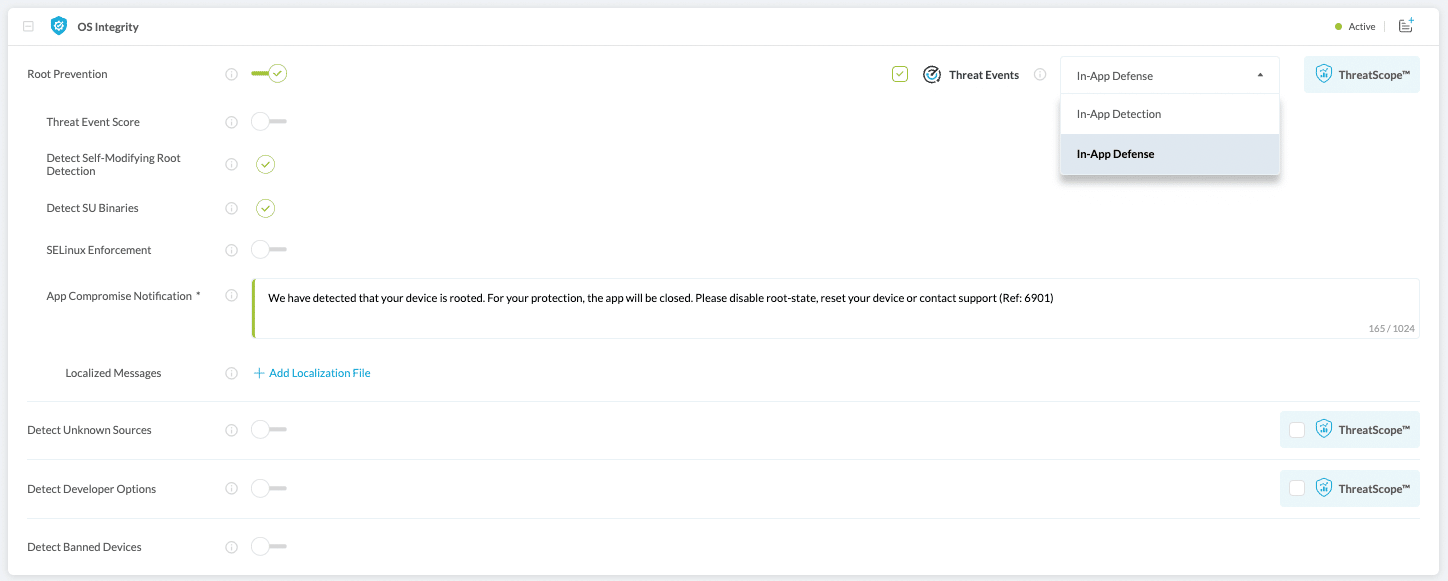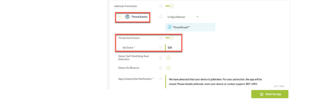 1. Click on the toggle to enable Jailbreak Prevention/ Root Prevention, check the Threat Events checkbox, and choose the notification mode (In-App Detection or In-App Defense).