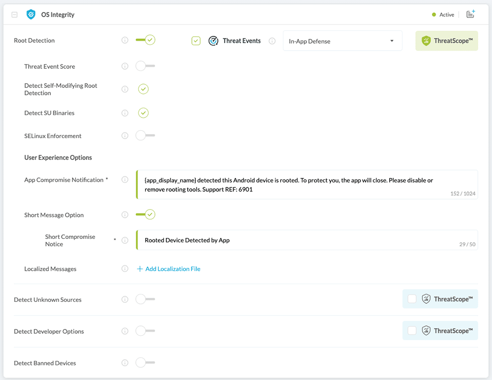 4. Click on the toggle to enable Detect Banned Devices (Android), select the Threat Events check box, and choose the notification mode (In-App Detection or In-App Defense).Root Detection