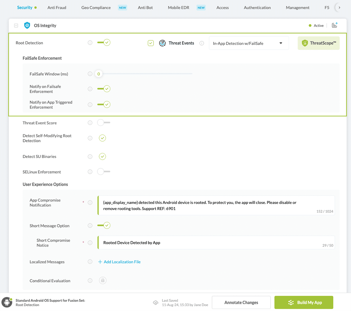 3. Click on the toggle to enable Detect Developer Options, select the Threat Events check box, and choose the notification mode (In-App Detection or In-App Defense).