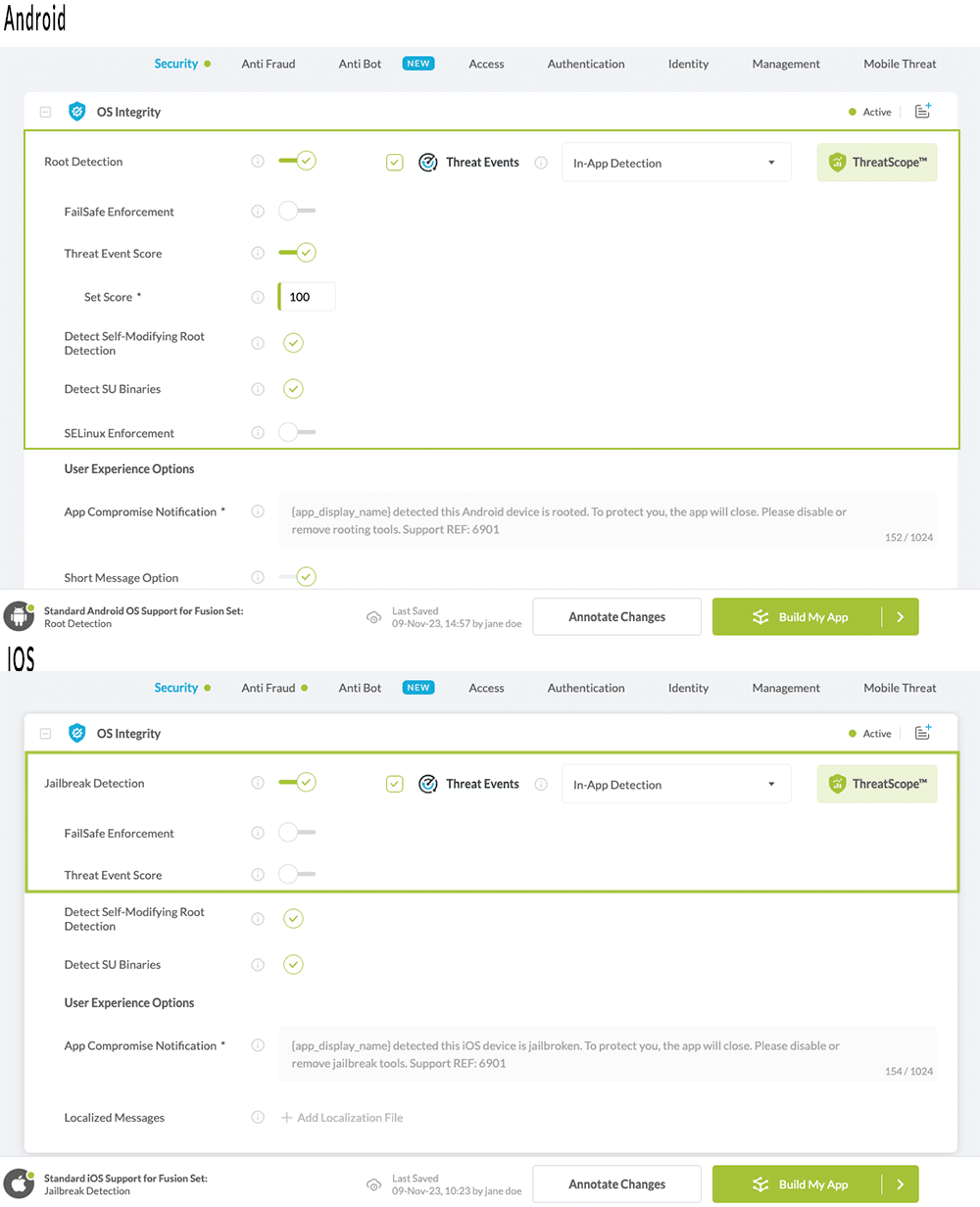 Some or all of the meta-data for each mobile application Threat-Event and Threat-Score can be consumed in Cordova Apps at the discretion of the mobile developer and used, in combination with other mobile application data, to adapt the business logic or user experience when one or more attacks or threats are present.