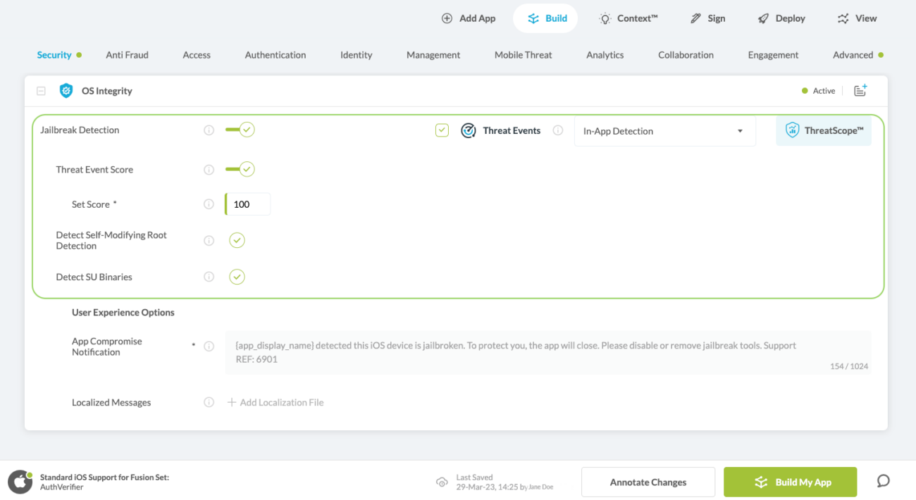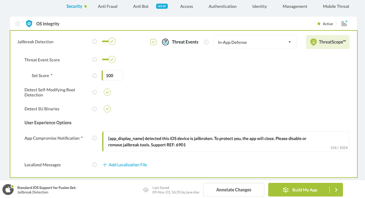 1. Set the Threat Event of the selected feature to “In-App Detection” mode.