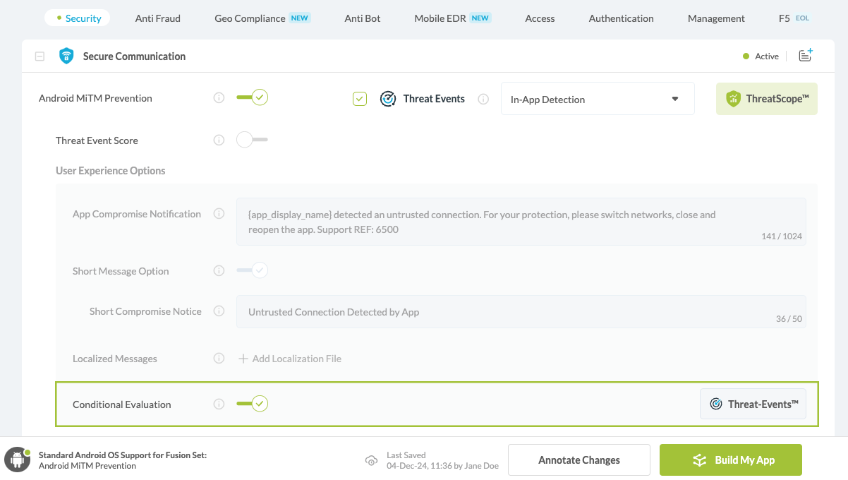 Note: We have used Android MitM Prevention as an example; you can enable Conditional Evaluation for any feature that includes Threat Events.