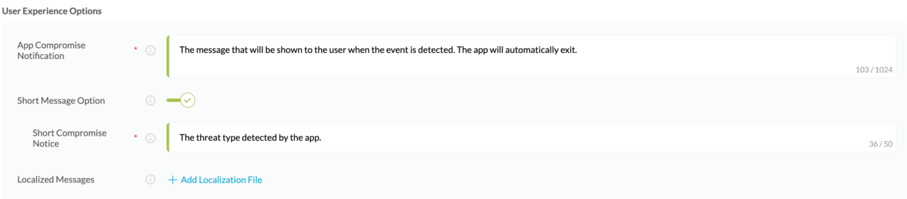 With Threat-Events™ OFF, Appdome provides several user experience options for mobile brands and developers.2.2.4.1. App Compromise Notification: Customize the pop-up or toast Appdome uses to notify the user when a threat is present while using the protected mobile app.2.2.4.2. Short message Option. This is available for mobile devices that allow banner notifications for security events.2.2.4.3. Localized Message Option. Allows Appdome users to support global languages in security notifications.