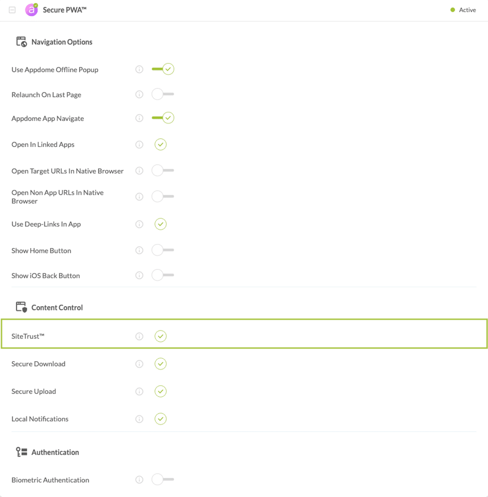 Appdome SiteTrust is a Secure PWA feature that protects non-public resources by restricting access/navigation to the home domain only, preventing unauthorized access to the mobile app’s backend and sensitive systems. When enabled, your SecurePWA app will only be able to access trusted domains and sites.