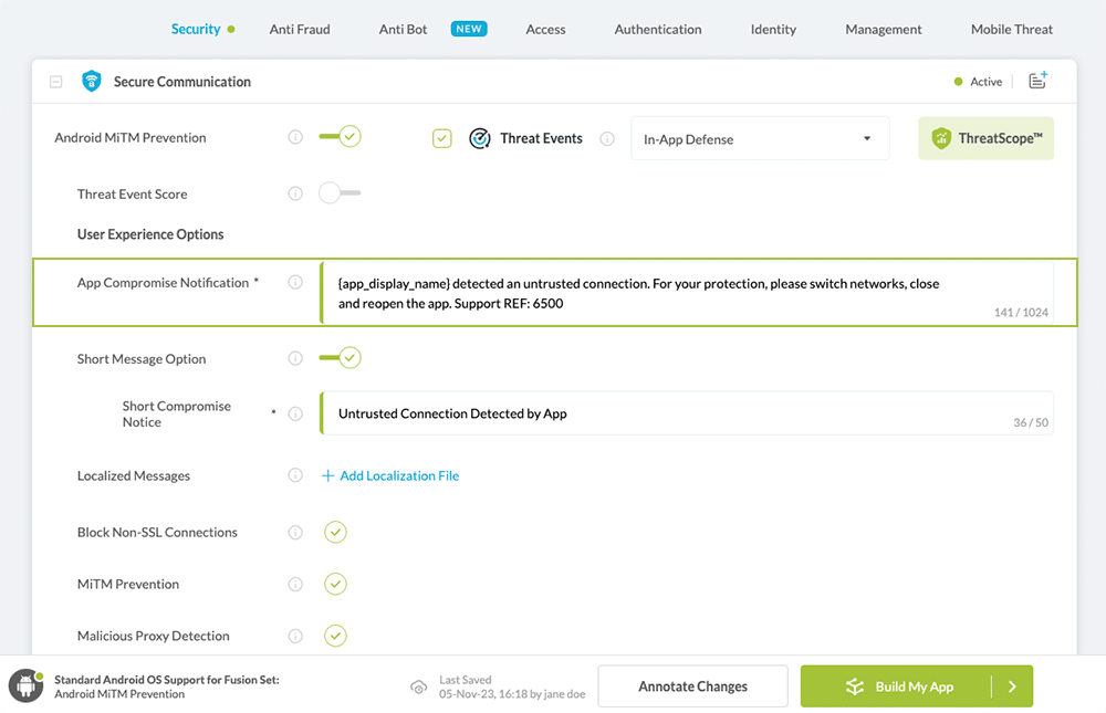 The content of the notification is specified below the specific threat in the App Compromise Notification field. A default message will be displayed if the customer does not provide the notification content. However, we advise customers to provide the notification content by specifying an easy-to-follow default remediation path for the mobile app end user. You can customize this message as required to achieve brand-specific support, workflow, or other messaging. For example, you can use the tag {app_display_name} which will be replaced with the app display name when the notification is displayed.