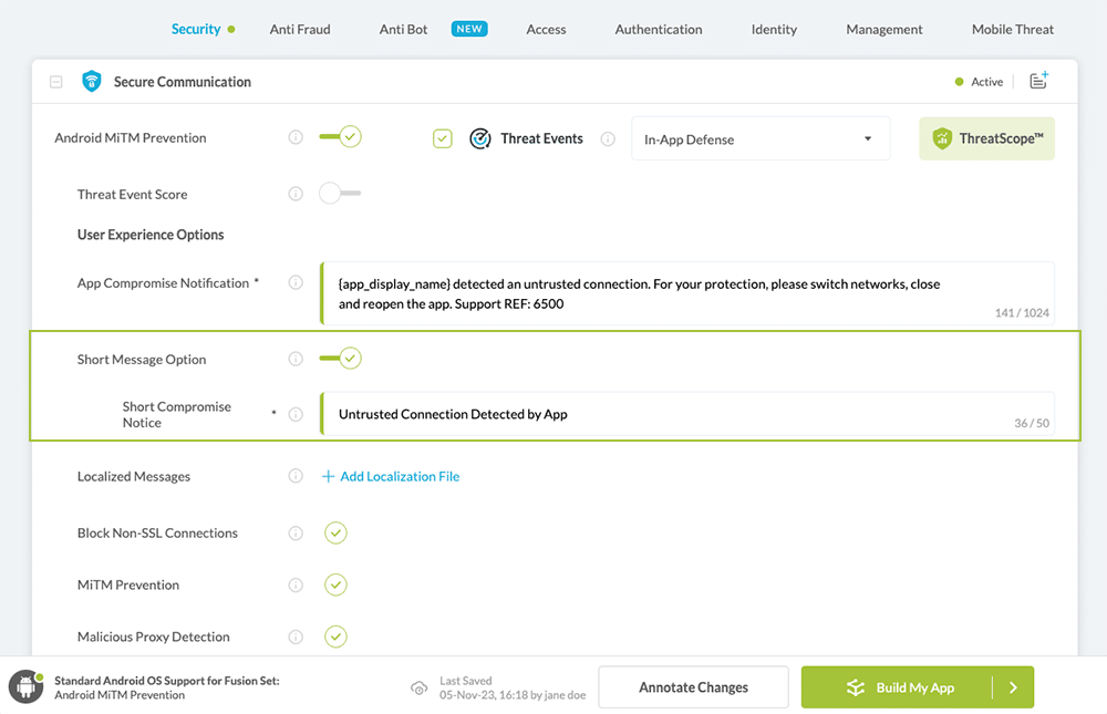 Disclaimer: The number of characters shown in the short compromise notification messages depends on factors such as the device, Android OS version, and device settings, which are all controlled by the Android OS and unrelated to Appdome. To ensure optimal readability across different devices and screen sizes, we advise keeping the text of the short message notifications as concise as possible.