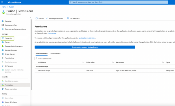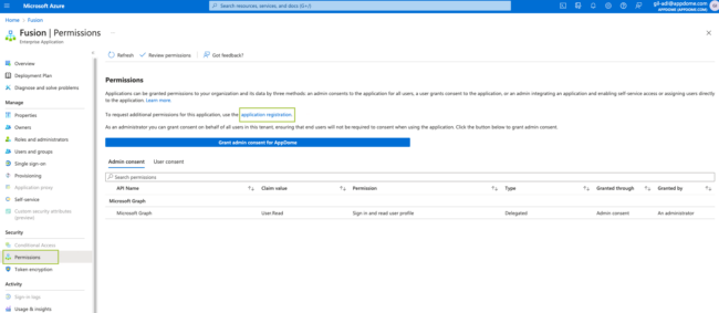 The granted permissions list is displayed. - Optionally, click Grant admin consent for AppDome to grant consent to all users in your organization when logging into Appdome.