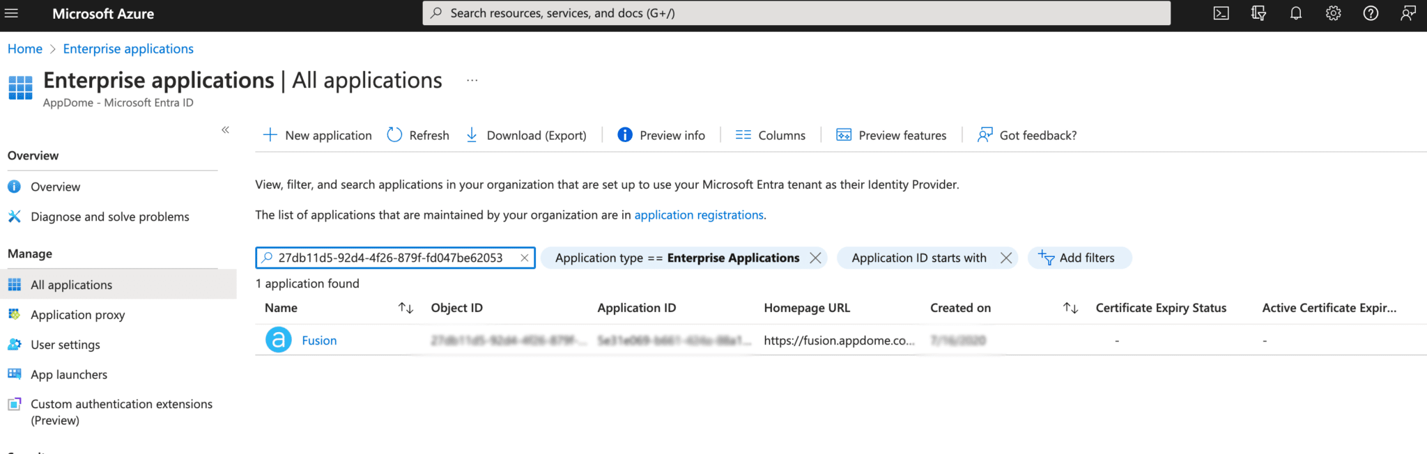 - Within the Enterprise Application service, search for the object ID: 27db11d5-92d4-4f26-879f-fd047be62053