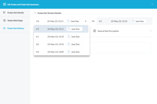 This tab allows viewing all versions of the Fusion Set and the annotation you made for each change, as well as comparing between versions and creating one or more new Fusion Sets based on a specific version.