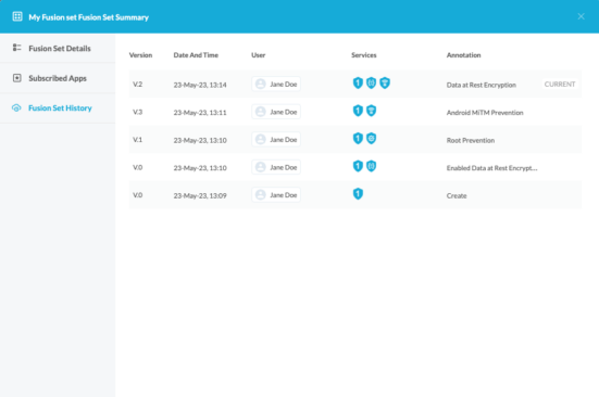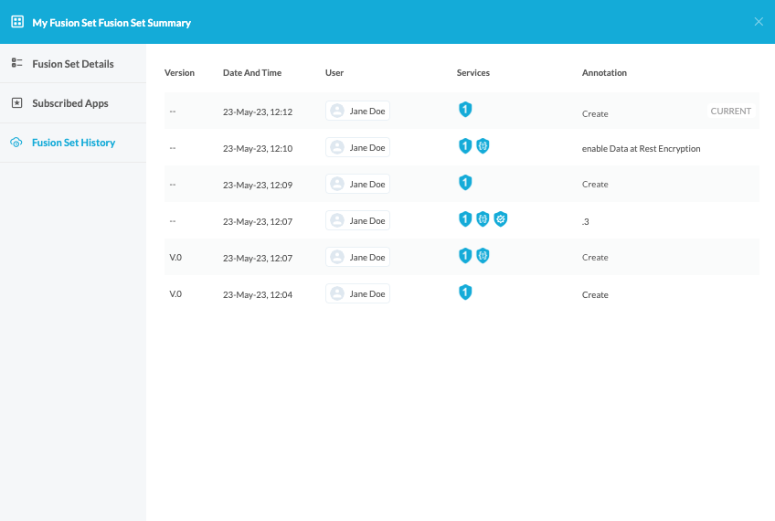 Each Fusion Set version is displayed in a separate row, with the most recently created Fusion Set version at the top.