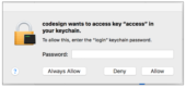 Codesign needs authorized access to your signing certificate in the Keychain. The password for your keychain is normally your user’s password (the one used for logging in to your computer). To ensure that the automatic private signing script runs without interruptions, you are strongly advised to set the option “Always Allow for authorized access to the Keychain.”