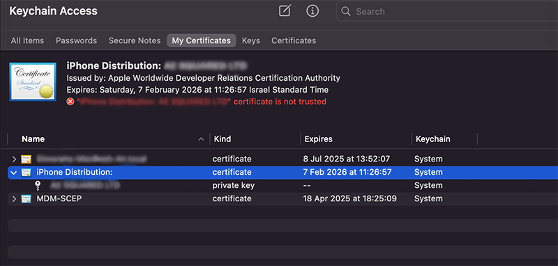 - The certificate (with private key) used to sign the app in Xcode must be stored in Keychain Access. For more details, see: How to Generate a P12 Certificate for Signing an iOS App