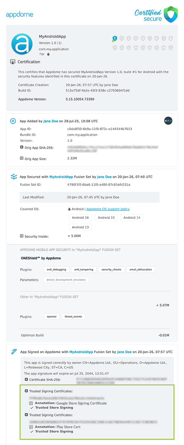Appdome uses a Trusted Signing model to validate Android app signing based on authorized certificate fingerprints, rather than distribution-specific signing options. Customers explicitly define which signing certificates are trusted, and any app signed with one of these certificates is considered valid and will not trigger anti-tampering protections. This unified approach replaces previous toggle-based signing behavior and enables the same app build to be used consistently across production, testing, and enterprise distribution workflows.
