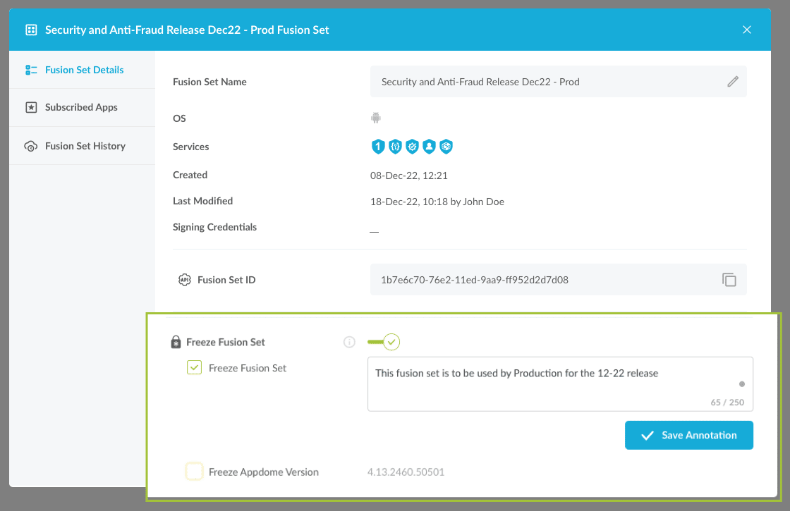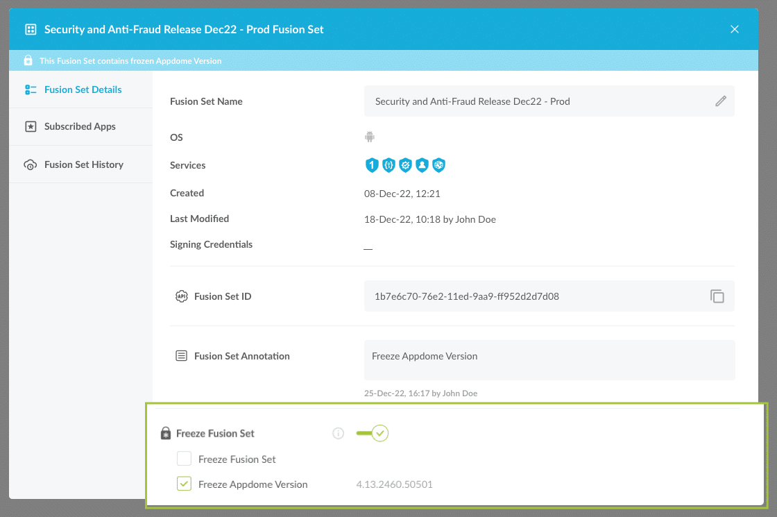 Upon enabling (toggling On) Freeze Fusion Set, the check box Freeze Appdome Version is displayed. As seen in the images below, the Appdome Version is displayed next to the check box, regardless of whether the check box is selected.