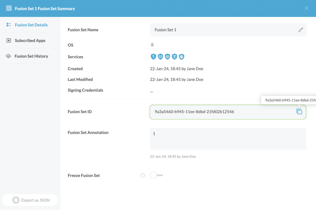 To better understand how the compare fusion set API works, we have included two fusion set policy examples titled “Test Fusion Set 1” and “Test Fusion Set 2”, both set up for an Android application.