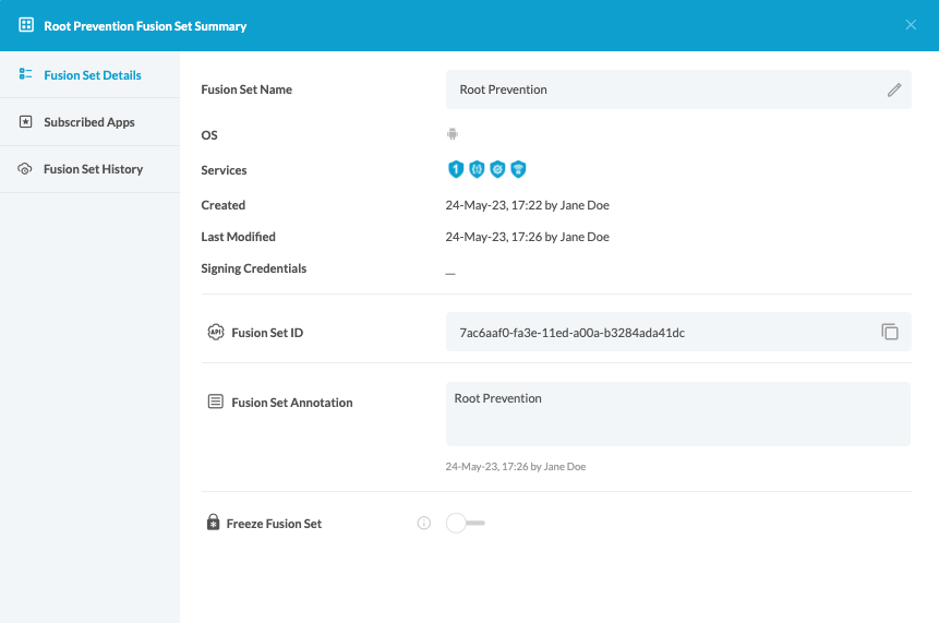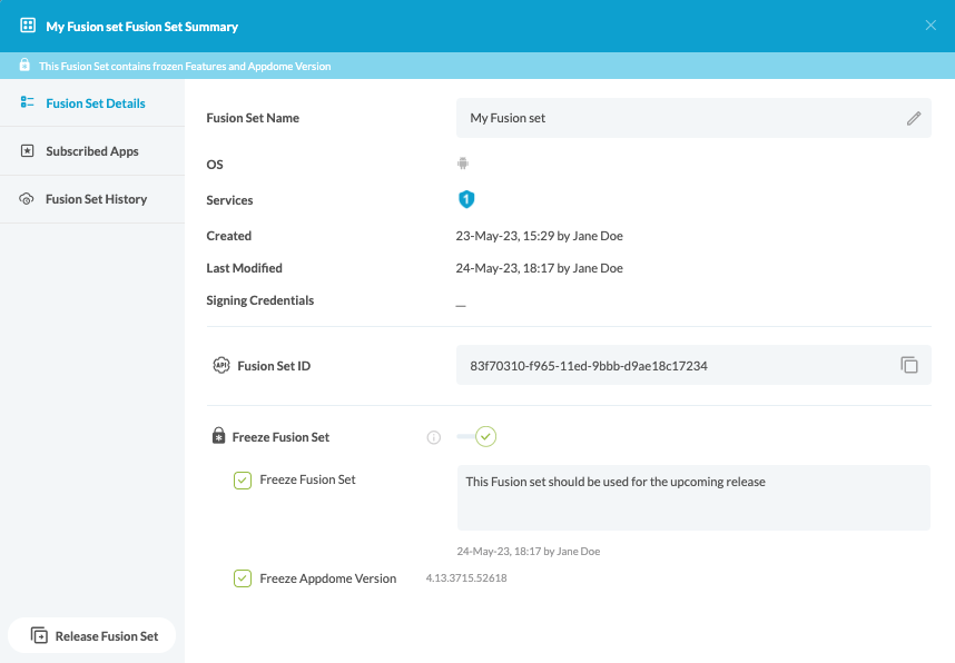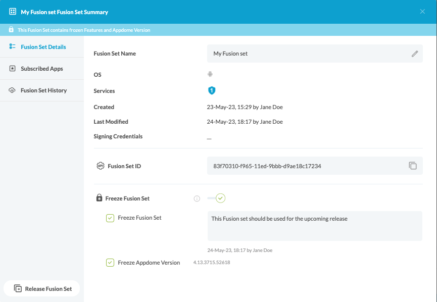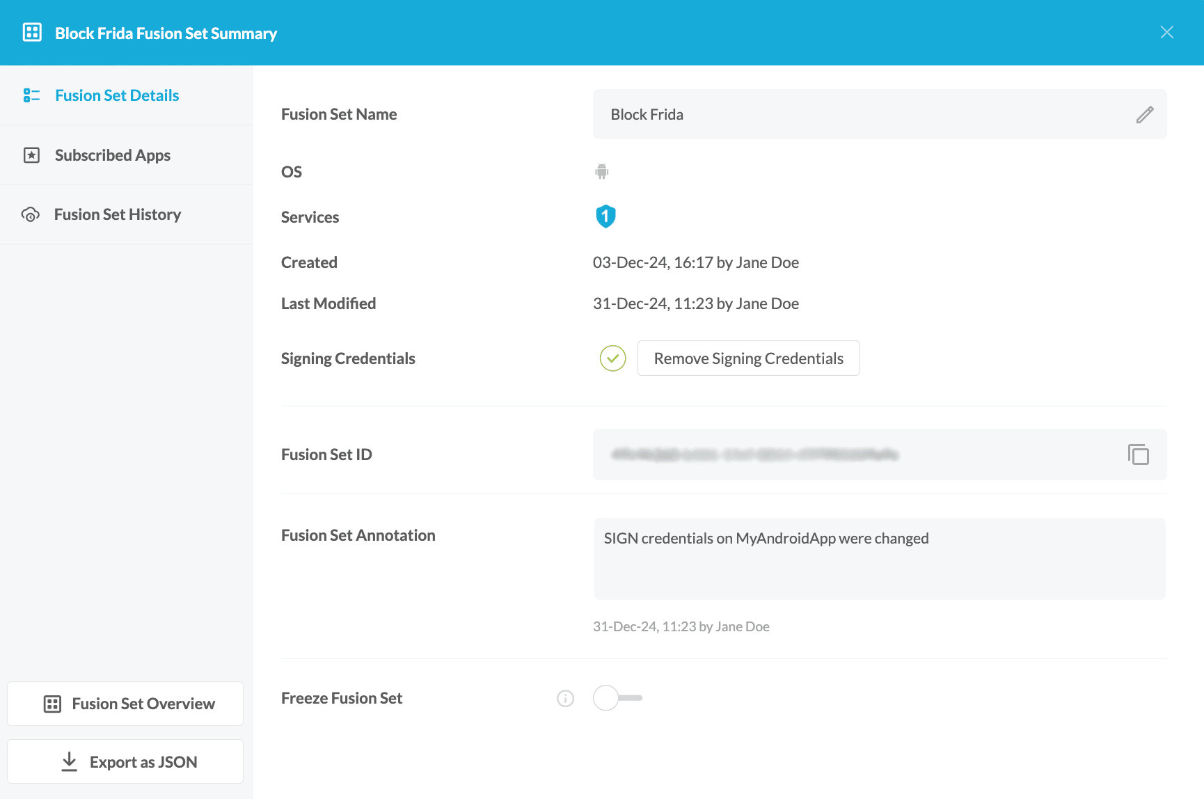 Indication of the signing credential saved in this Fusion Set (app-specific). It is now possible to remove signing credentials from a Fusion Set if they are no longer needed. To remove signing credentials, navigate to the Signing Credentials field, click the Remove Credentials button, and confirm the action.