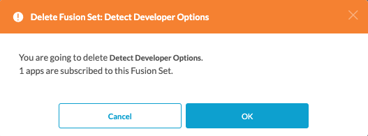 Deleting a Fusion Set affects all apps that are subscribed to the Fusion Set at the time of the deletion. After the deletion operation is confirmed, all subscribed apps will revert to be subscribed to the Playground Fusion Set.