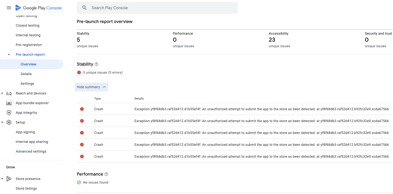 The app will pass the upload stage but fail during Google’s internal stability tests, which prevents it from being published. Google uses RoboTest to perform sanity tests; Appdome purposely injects a detection method that shows the app is running on RoboTest and crashes the app. This is done to prevent secured Appdome apps that include exposed diagnostic logs from being uploaded and published to the Google PlayStore.