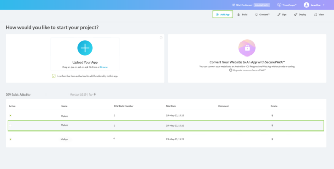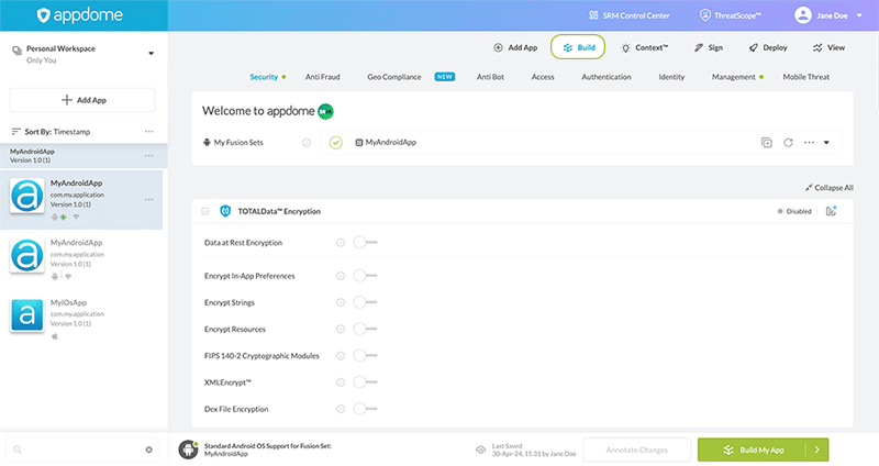 - Build Your App: Navigate to the “Build” tab to start adding security features to your selected app.