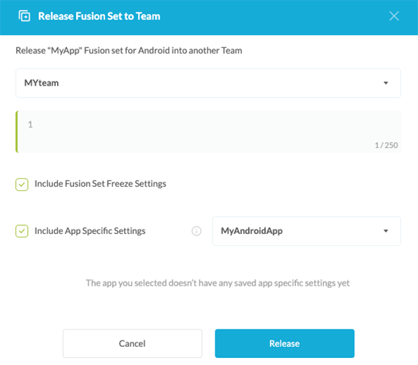 • To Release the Fusion Set with specific app settings (e.g., context and app-signing settings and credentials, etc) check the box “Include App Specific Settings“. Then select the app from the dropdown list (optional).