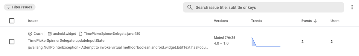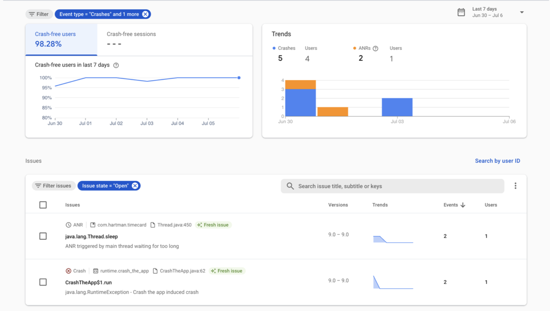 - In the Crashlytics main dashboard, click Filter on the top left, and select the relevant issue type (Crashes or ANRs), then click Apply.