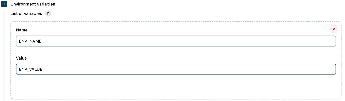 When using the configuration form, any input that has the same field as an environment variable (e.g. validate app’s path) will take precedence, i.e. it will override the environment variable. Therefore, to ensure proper use of the environment variable input, you must verify that these variables are unique and do not appear in the configuration form.