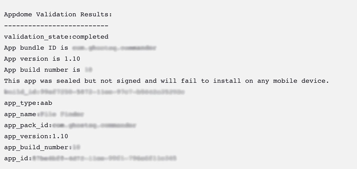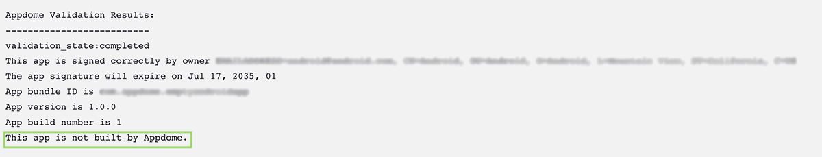 Within the console log, you can meticulously examine the results to gain a comprehensive understanding of the specific reasons behind the failure. For instance, if the application lacks the necessary protection provided by Appdome, you will receive a warning, exemplified as follows: