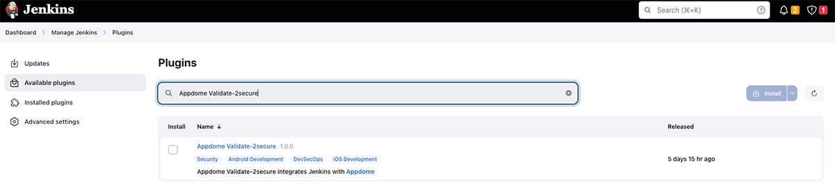 - Add the Appdome Validate-2secure plugin to Jenkins through the Jenkins Plugin Index: