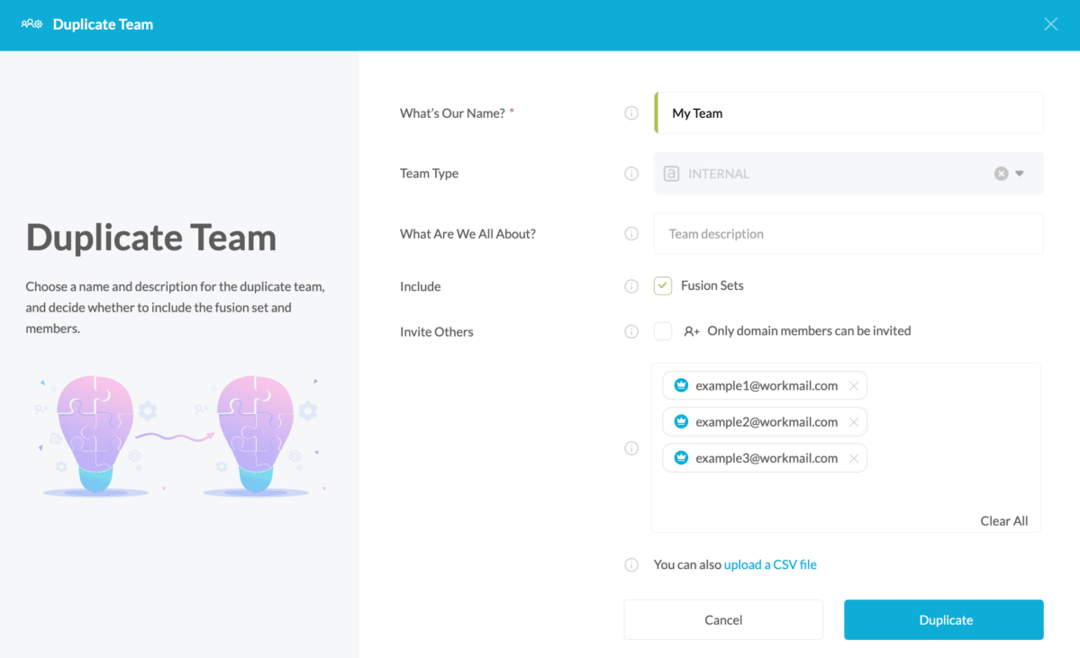 - Click Duplicate on the bottom right to create the duplicated team.