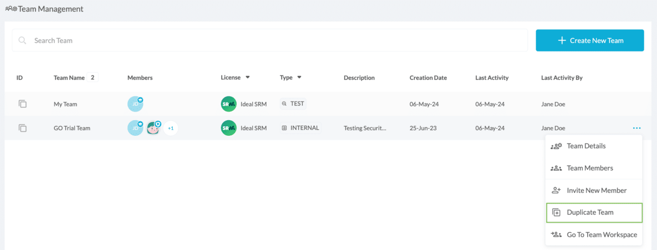 The Team Duplication feature allows you to duplicate the details of an existing team, thereby saving the need to re-configure the team’s mobile app security templates (fusion sets) or manually add team members and their entitlements.