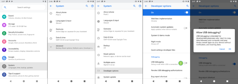 - Go back and now access the Developer options menu, select the check box USB debugging and click OK on the prompt