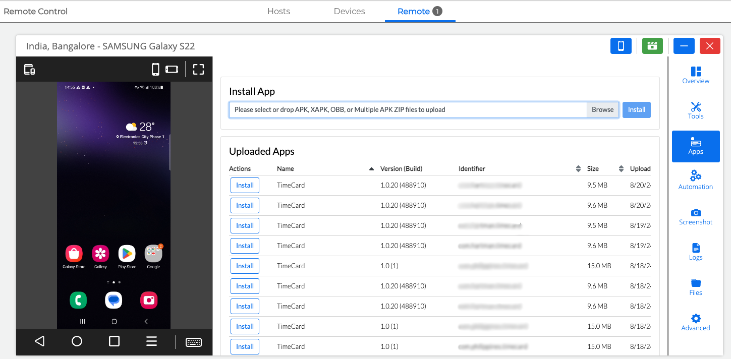 - Select one of your uploaded apps and click ‘Install.’ Alternatively, click ‘Browse‘ to upload your Appdome Build2Test app and then install it.