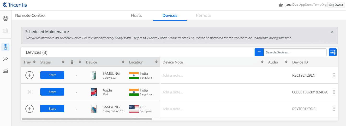 - Choose a device and click ‘Start‘.