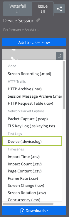 Choose from the download drop-down menu which tests you want to export—for example, device logs.