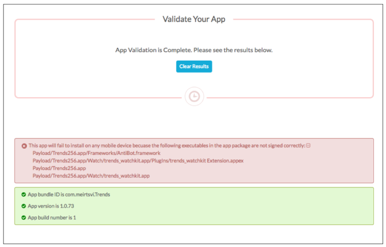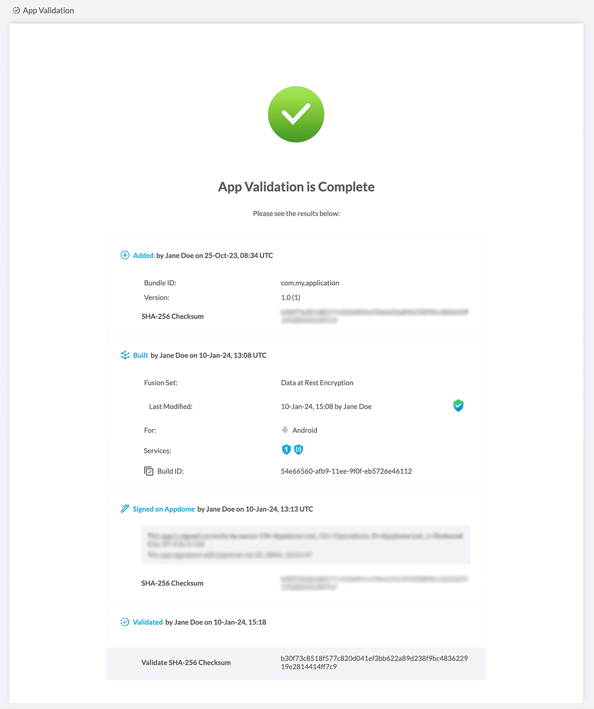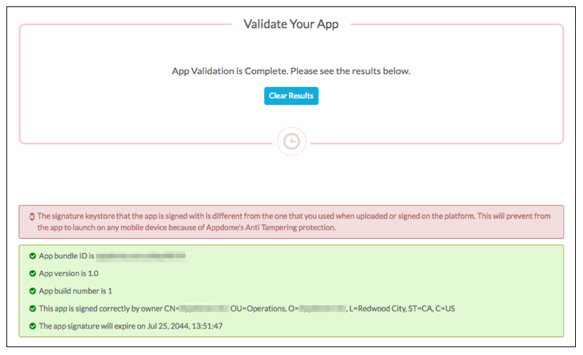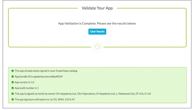 When the app validation process is complete, Appdome will present the results of the validated app signing at the bottom of the screen.